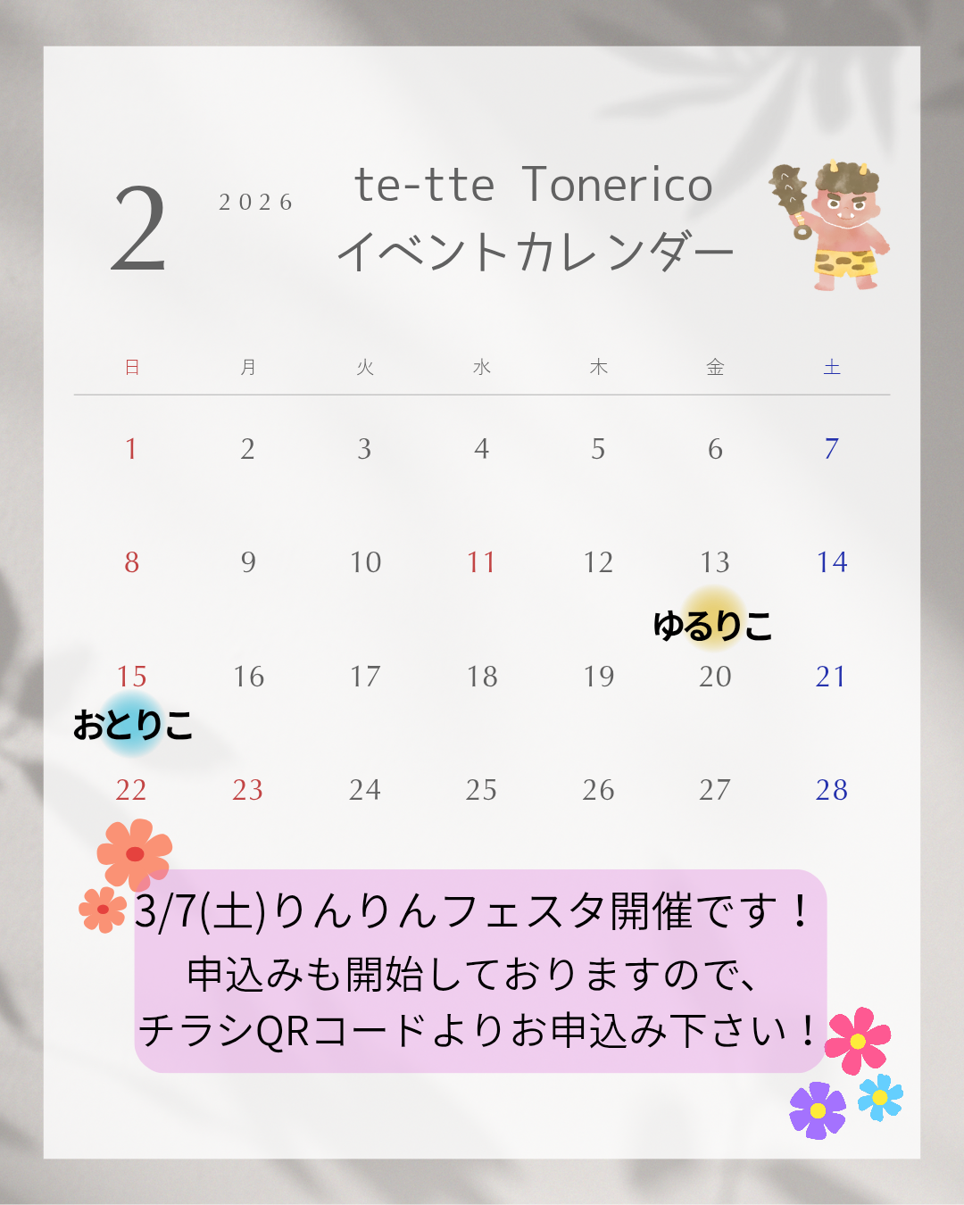 2月に開催されるとねりこのイベントです✨気になるイベントがございましたらお気軽にお問い合わせくださいませ☺️イベントの詳細は投稿をご覧ください。
