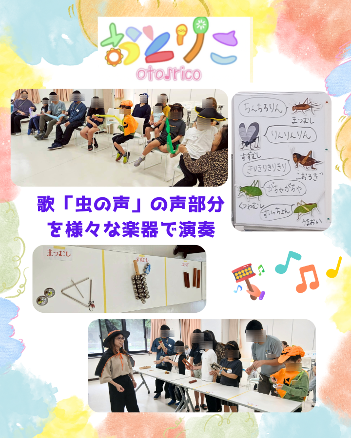 今回は「虫の声」の歌にあわせて合奏を✨どの楽器がどの昆虫の声に似ているかを考えながら合わせた合奏では、一生懸命楽器を鳴らしてくれました!🦗「この虫の声はこういう楽器の方がいいんじゃない?」と提案を伝えてくれたり、歌に合わせてリズムをとることができました🎵