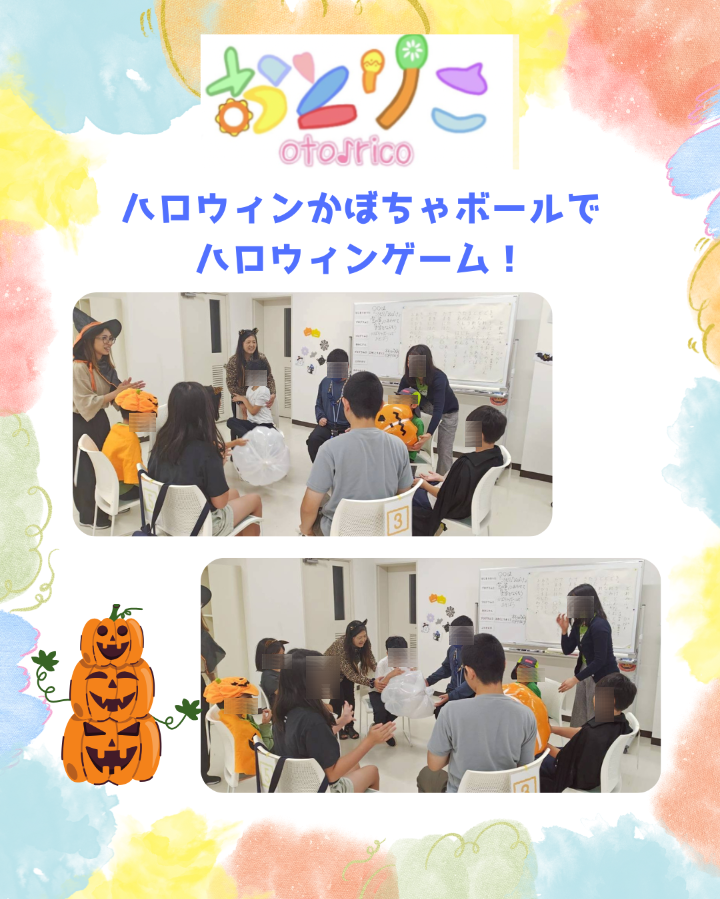 音楽に合わせてかぼちゃボールで遊ぶアクティビティ🎃では、落とさないように工夫しながら力を合わせて上手にキャッチ!みんなで楽しみました✨
