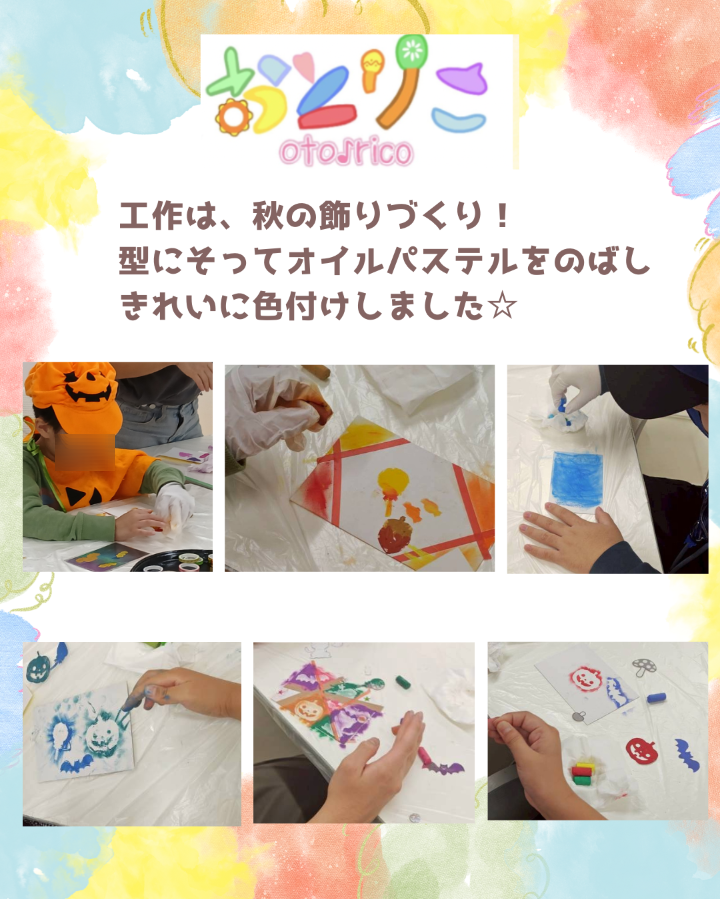 工作は秋の飾り作り🍁🎃秋のモチーフの型を使い、オイルパステルで色を乗せて作成しました。