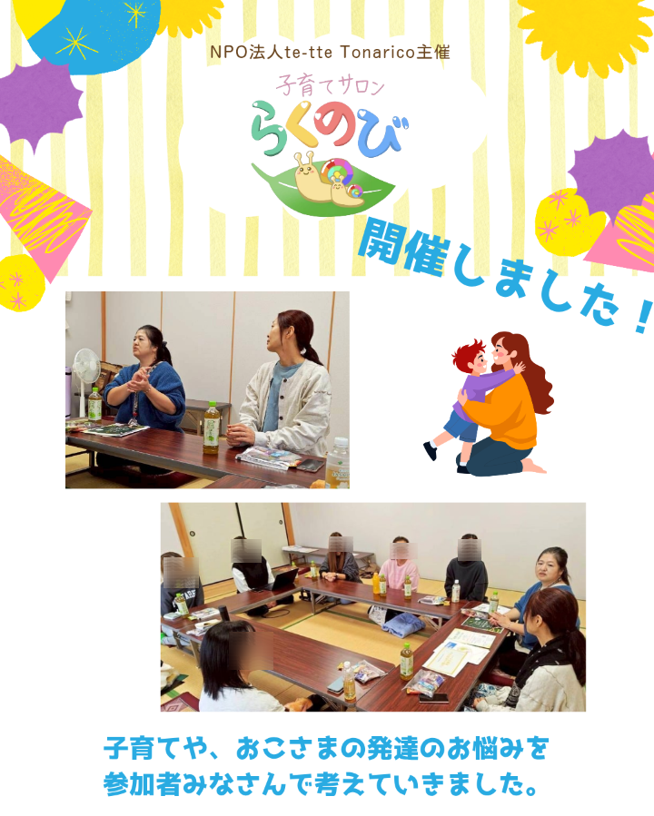 「子育てサロン らくのび」は、ホッと一息ついて、安心して話せる・繋がれる場所です。ご参加いただいた皆様、講師のさやか先生、本当にありがとうございました!次回のらくのび開催もどうぞお楽しみに!